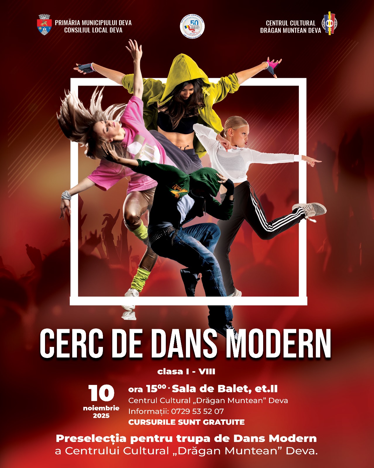 Luni, 10 noiembrie 2025, de la ora 15:00, la Centrul Cultural „Drăgan Muntean” se organizează preselecția pentru Cercul de Dans Modern (clasele I–VIII). Preselecția va avea loc în Sala de balet, situată la etajul II al Centrului Cultural.