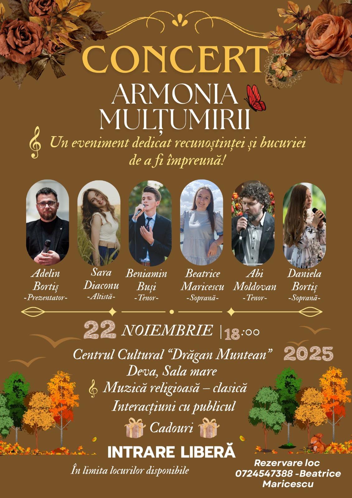 „Armonia Mulțumirii” este titlul unui concert de muzică religioasă, care va avea loc sâmbătă, 22 noiembrie 2025, la ora 18:00, în Sala mare a Centrului Cultural „Drăgan Muntean” Deva.