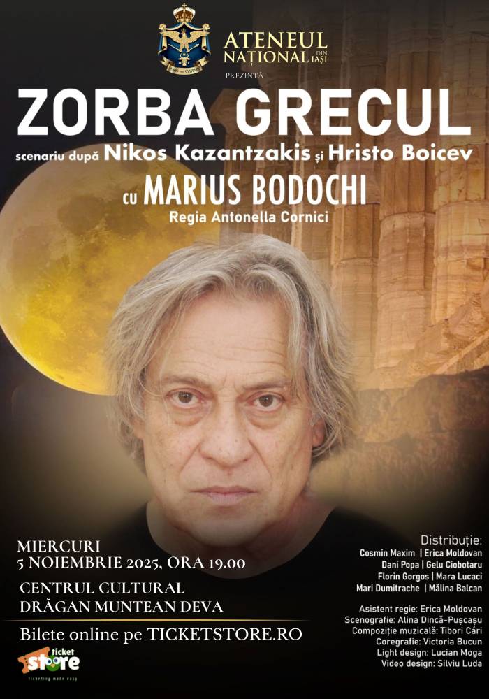 Ateneul Național Iași vă invită MIERCURI, 5 Noiembrie, ora 19.00, la Centrul Cultural „Drăgan Muntean” la spectacolul Zorba Grecul, un spectacol despre oameni cu sânge fierbinte, despre sălbăticiune și inadaptare umană, despre semnificațiile vieții.