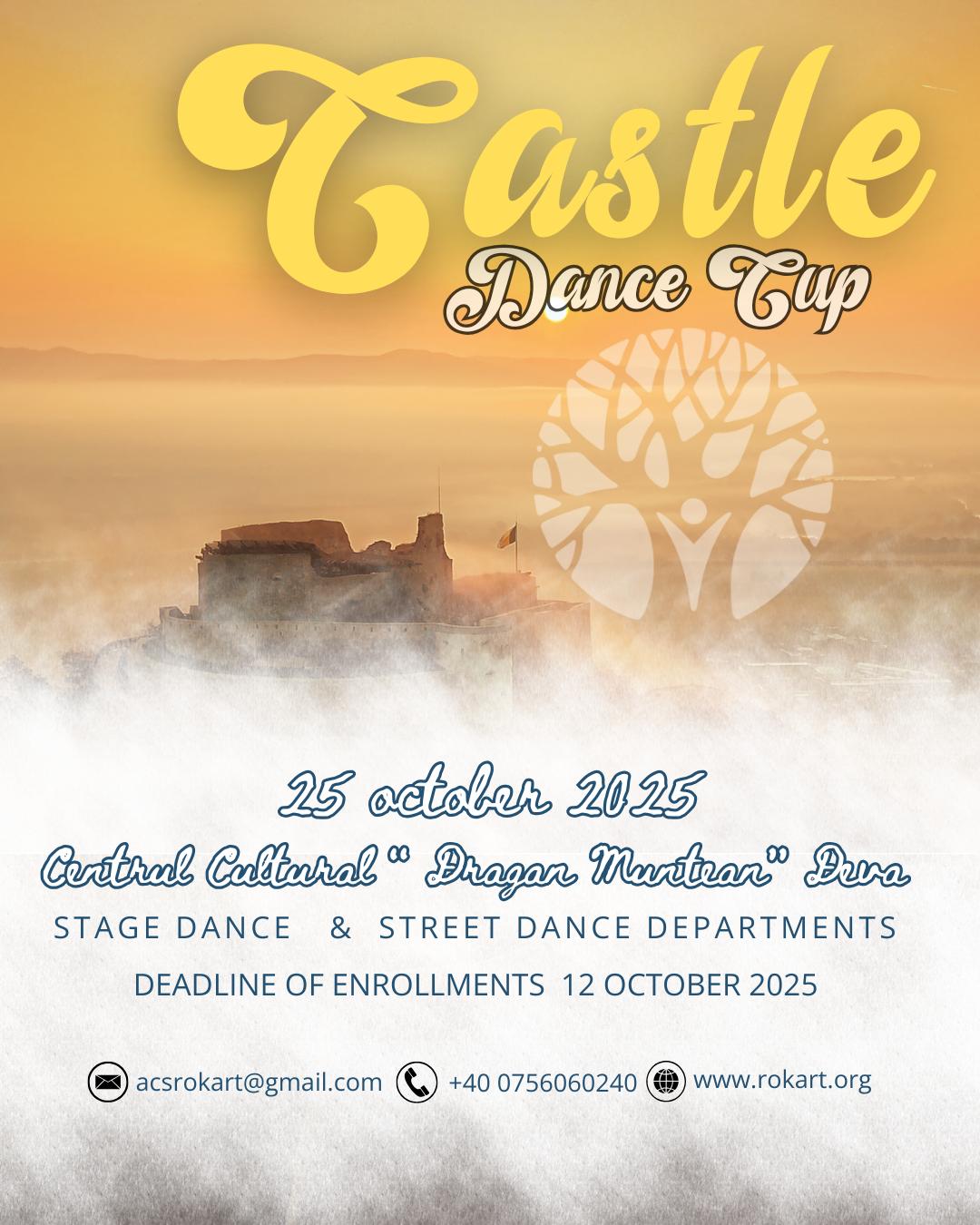 Asociația Culturală „RoKArt” în parteneriat cu WADF (WORLD ARTISTIC DANCE FEDERATION) vă invită în data de 25 octombrie 2025, între orele 08:00 – 22:00, în Sala Mare a Centrului Cultural „Drăgan Muntean” la competiția „Castle Dance Cup”, un eveniment dedicat dansului și artei mișcării.