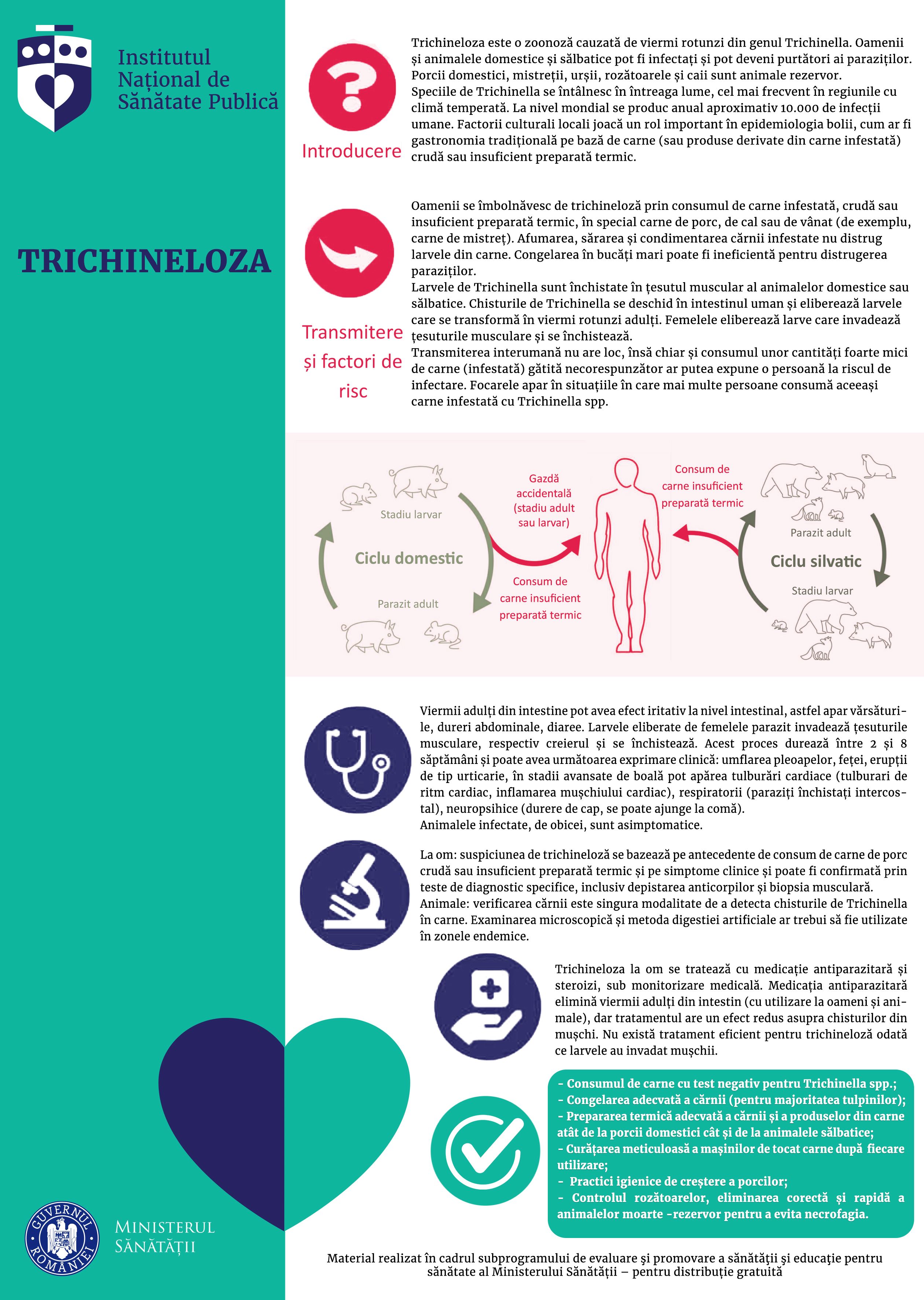 Trichineloza este o boală infecțioasă, cauzată de larvele unui vierme parazit și este transmisă de la animale la om, prin consumul de carne crudă sau insuficient preparată termic.
