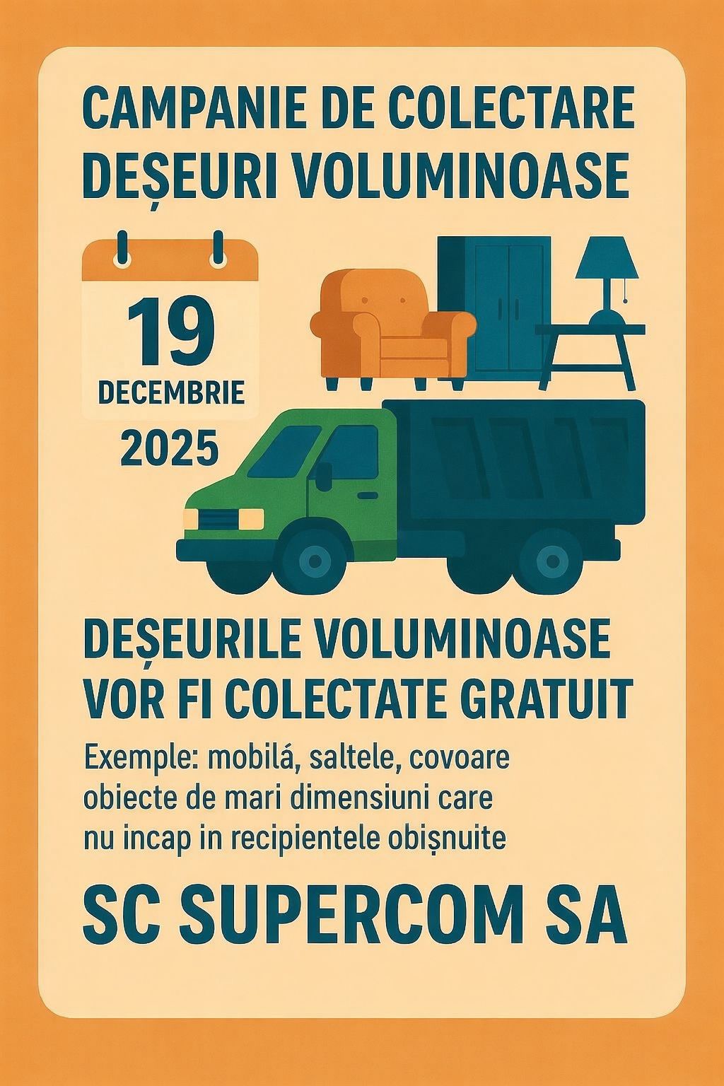 Operatorul SC SUPERCOM SA anunță organizarea unei acțiuni de colectare a deșeurilor voluminoase vineri, 19 decembrie 2025, în municipiul Deva.
