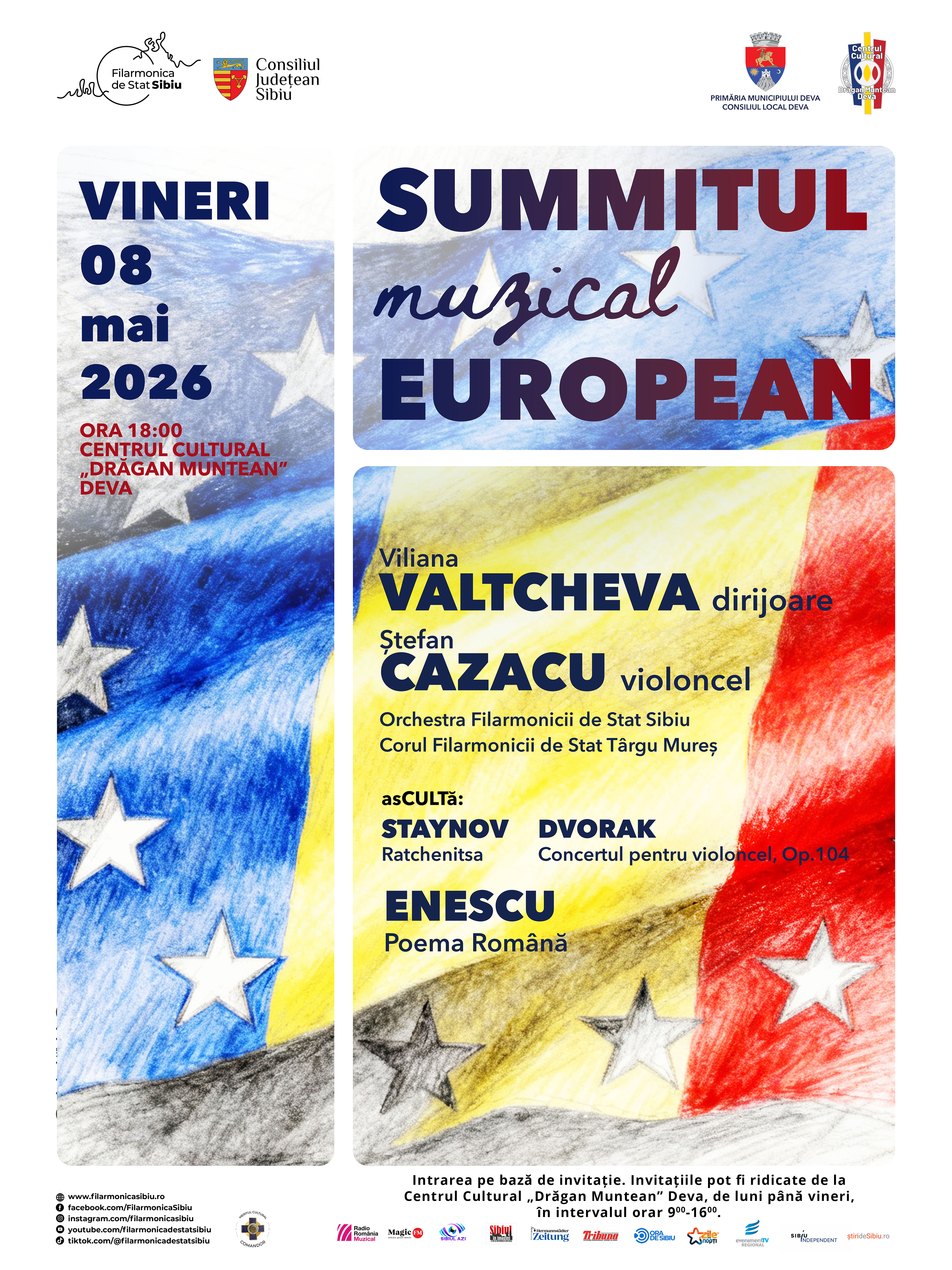 Primăria Municipiului Deva, Consiliul Local Deva și Centrul Cultural „Drăgan Muntean” invită publicul vineri, 8 mai 2026, de la ora 18:00, la un eveniment de excepție - „Summitul Muzical European”, susținut de Filarmonica de Stat Sibiu, cu ocazia Zilei Europei.