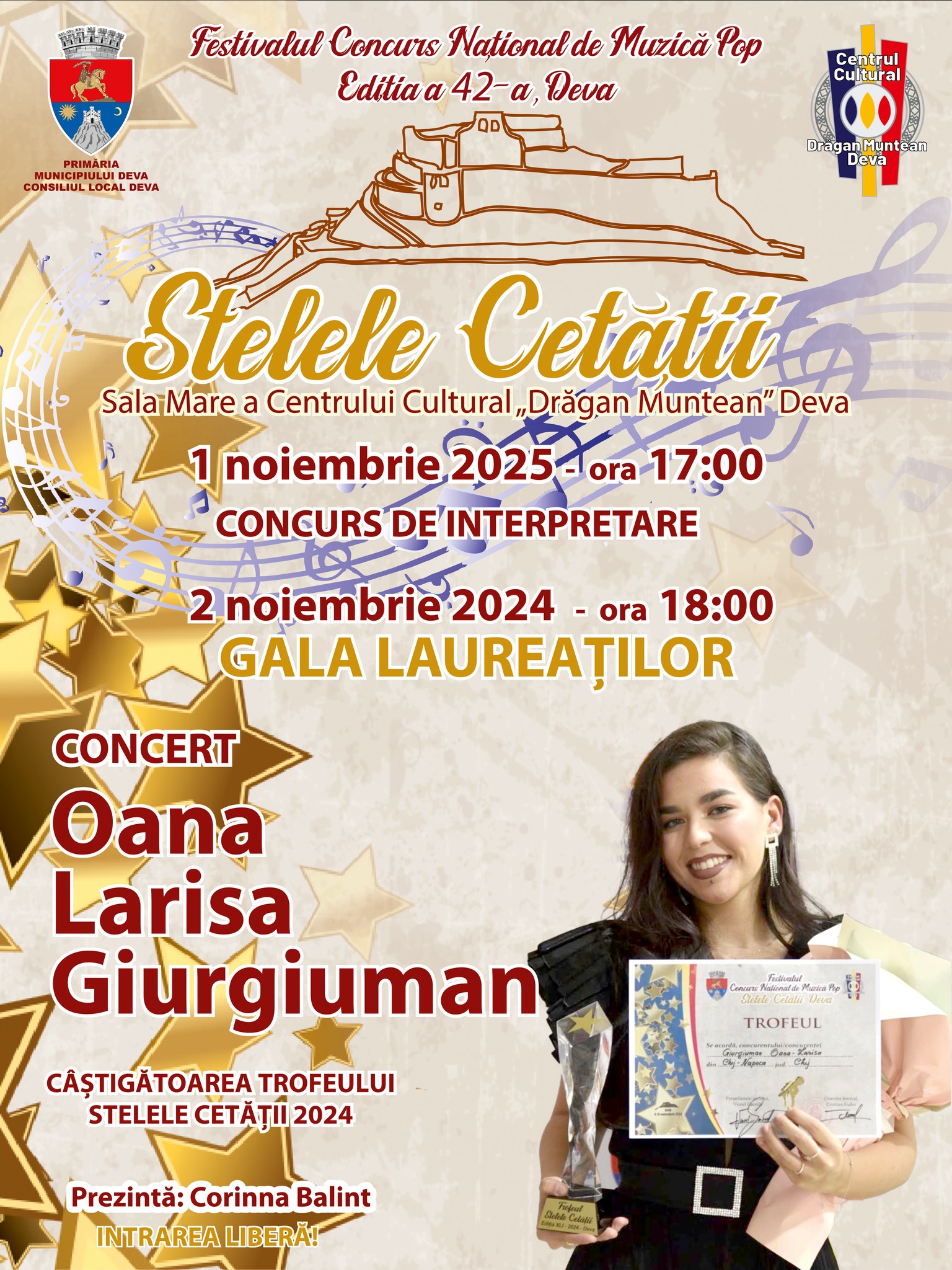 Primăria Municipiului Deva și Centrul Cultural „Drăgan Muntean” Deva organizează în perioada 1-2 noiembrie 2025, în Sala Mare a Centrului Cultural „Drăgan Muntean”, cea de-a 42-a ediție a Festivalului Concurs Național de Muzică Pop „Stelele Cetății”