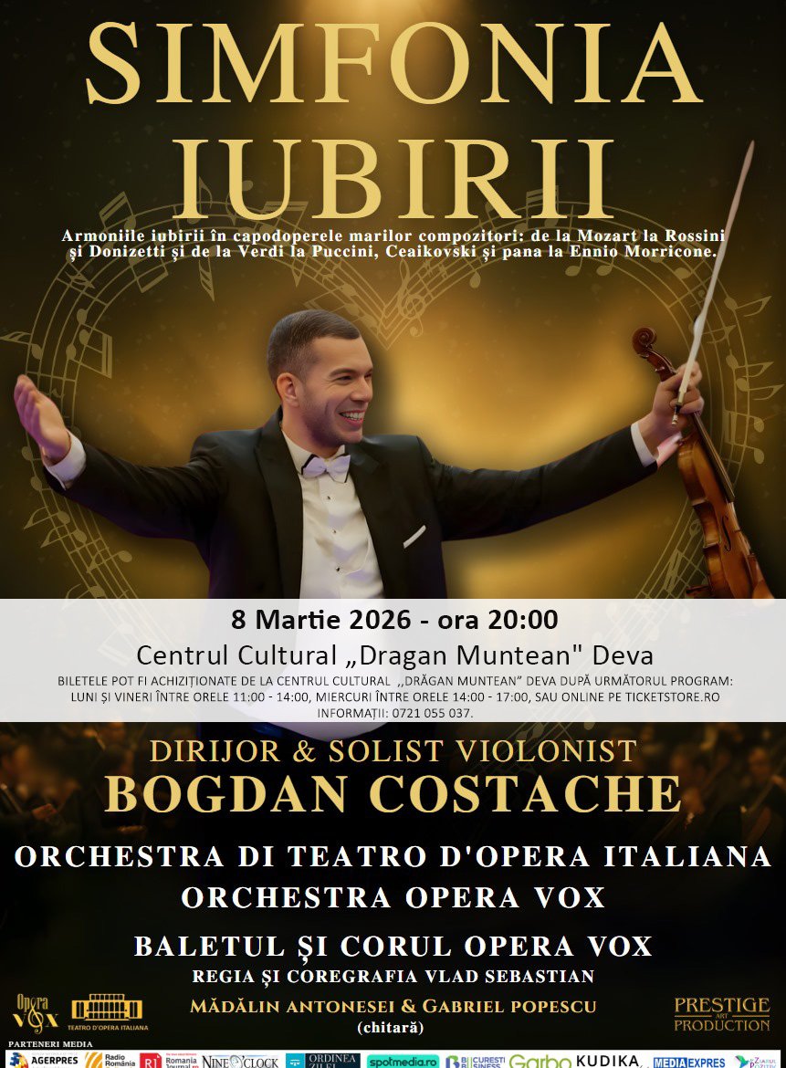 Cu prilejul Zilei Internaționale a Femeii, publicul din Deva este invitat duminică, 8 martie 2026, de la ora 20:00, la Centrul Cultural „Drăgan Muntean”, la un eveniment artistic de excepție: spectacolul „Simfonia Iubirii” – o celebrare grandioasă a iubirii prin muzică, dans și emoție autentică.
